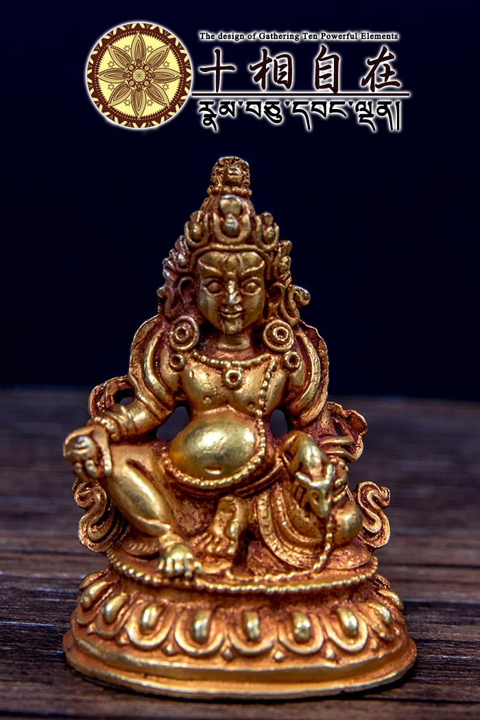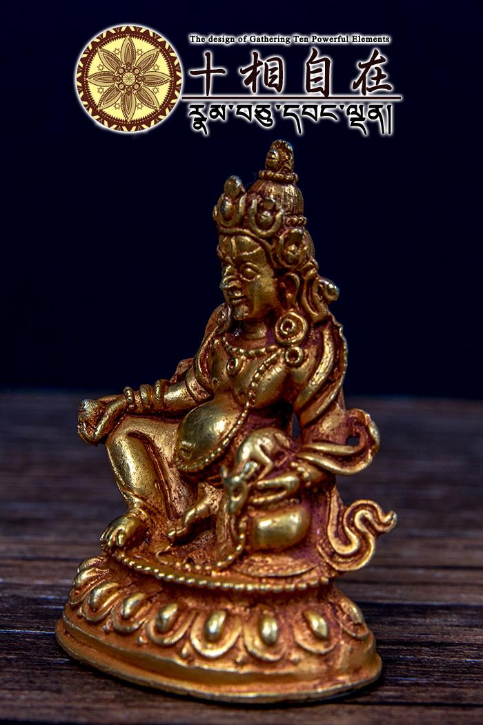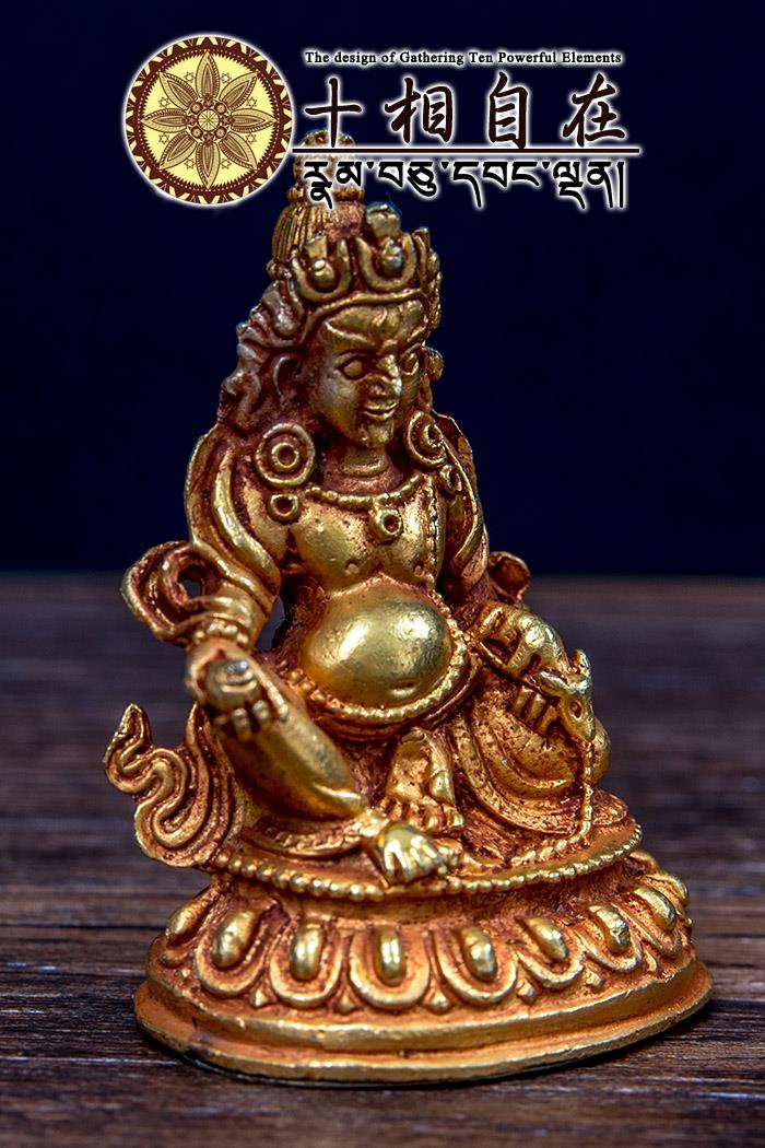 商品詳細介紹 【十相自在】黃財神小佛像 金色法像 Zambhala Serpo 黃財神,藏文叫做“諾拉”,翻譯成漢文叫做“財神”。藏名叫作“佔巴拉色波”或“藏色”,他的色膚是黃色,故稱為黃財神,是密教之護法神祇,諸財神之首,黃財神為藏地各大教派奉持的五色財神之一,五色財神分別是:白財神、黃財神、紅財神、藍財神、黑財神。 。黃財神的形象為上身袒露,下身著裙,右手持摩尼寶,象徵寶光普照十方,增添眾生的福報;左手抱一隻大貓鼬(吐寶鼠),鼬的嘴裡含著珠寶,象徵財寶。右腳踏一隻白色海螺,象徵著他能入海取寶。