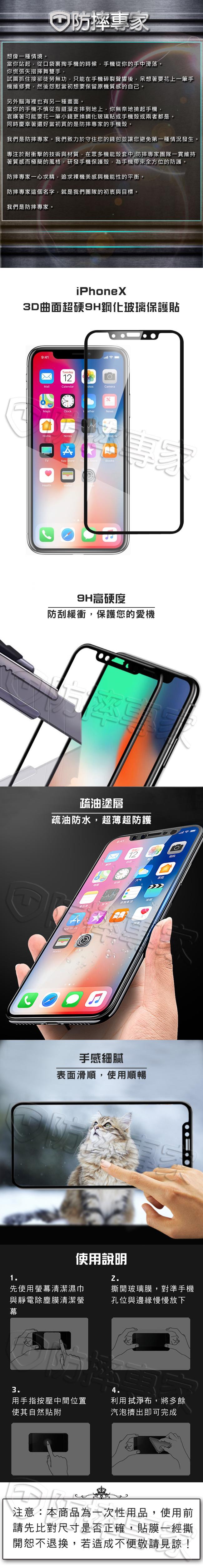 商品規格 種類 : 手機保護貼 類型 : 正面保護貼 適用廠牌 : Apple蘋果 適用系列 : iPhone X 功能 : 3D曲面, 鋼化 材質 : 玻璃 屏幕 : 滿版 顏色 : 黑色系 注意事項 : 新品瑕疵請於10日鑑賞期內退換,退換貨請將商品及完整包裝退回。 備註 : 保固期限:無 保固範圍:新品瑕疵 體驗說明 使用方法說明 詳見商品介紹 注意事項 *商品會依螢幕不同而有色差,商品請以實際收貨為主 *商品不包含手機 *此為一次性使用商品,使用前請仔細確認尺寸