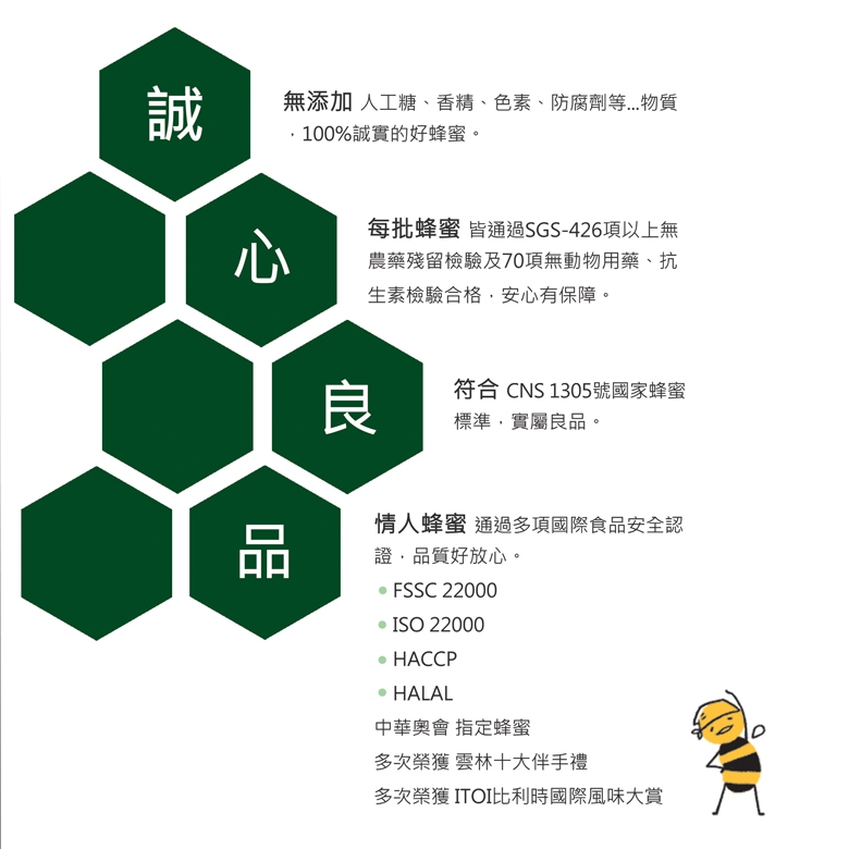 商品規格 品牌 : 情人蜂蜜 類型 : 蜂蜜 內容物說明 : 成份:蜂蜜 食品添加物:無 產地 : 泰國 包裝 : 盒裝, 瓶/罐裝 保存方式 : 常溫請置陰涼處 份數/規格 : 700g *2瓶 保存期限 : 3年 廠商名稱 : 情人蜂蜜股份有限公司 廠商地址 : 雲林縣土庫鎮建國路86號 客服電話05-6628888 熱量 : 323大卡/ 每100公克 每份營養成分 : 如產品外盒標示 咖啡因含量 : 0 投保產品責任險字號 : 商品已投保新光產物保險公司產品責任險 5千萬 元整。 食品業者登錄字號 : P-116860814-00001-8 體驗說明 使用方法說明 ※ 可將蜂蜜加入40度C以下冷開水或溫開水中沖泡調勻。 ※ 夏日於蜂蜜水中加入冰塊或檸檬片風味更佳!冬日可加入紅棗或薑片飲用,滋養又暖身。 ※ 蜂蜜極適合加入牛奶、茶飲、果汁、咖啡等...飲品中,除增加飲料甜味外,可讓飲品口感更美味加分! ※ 蜂蜜可用於甜品烘焙、抹醬、烹飪調味、醬料調製使用,讓料理香氣十足,口感層次更豐富。 注意事項 1. 兒童宜用蜜,但3歲以下嬰幼兒因腸胃系統尚未完善發育,請暫勿餵食蜂蜜。 2. 蜂蜜結晶乃天然物理現象,如遇結晶,可連玻璃瓶隔水加熱於60度以下溫熱水還原蜂蜜,亦可作抹醬食用,別具一番風味。 3. 如對蜂蜜有過體質、或特殊疾病、及食物成份相衝禁忌者,請諮詢醫師囑咐斟酌是否食用。