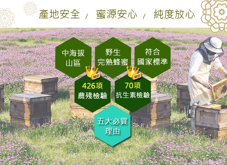 特色:呈深琥珀色,原生態蜂蜜,中海拔高山區果樹百花匯聚而成,純淨天然,自然完熟。