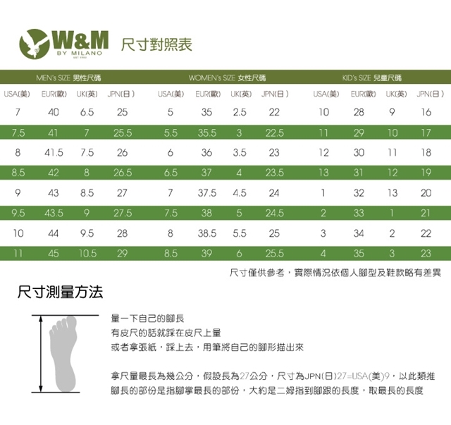 商品規格 定位 : 專櫃品牌 品牌 : W&M 適用性別 : 女生 款式 : 休閒鞋 尺寸 : 22cm, 22.5cm, 23cm, 24cm, 25cm 版型 : 正常 備註 : 商品規格 型號:19123-0905-86 鞋底高度:約6公分 商品尺寸:女(歐碼)35~39 產品顏色:裸粉 材質:牛皮/橡膠發泡 產地:台灣 包裝:原廠鞋盒 體驗說明 使用方法說明 X 注意事項 尺寸 tips 量一下自己的腳長和腳寬 有皮尺的話就踩在皮尺上量 或者拿張紙,踩上去,用筆將自己的腳形描出來 拿尺量最長和最寬各為幾公分 腳寬的部份是指腳掌最寬的部份,大約從大姆趾到小姆趾下方,取最寬的寬度 腳長的部份是指腳掌最長的部份,大約是二姆指到腳跟的長度,取最長的長度 因每台顯示廠牌不同有所差異,我們盡可能讓誤差所小至可容許範圍, 但絕無法保證100%相同 注意 : 顧客可於商品送達的七日內辦理退貨。 每張訂單僅提供乙次免運費退貨服務,辦理退貨時如有活動贈送品或配件請集中一次退還,如有遺漏需自行付費寄回。 故為避免爭議發生,請於辦理退貨前確實驗收退貨品項,與您申請的退貨商品無誤,再進行包裝辦理退貨。
